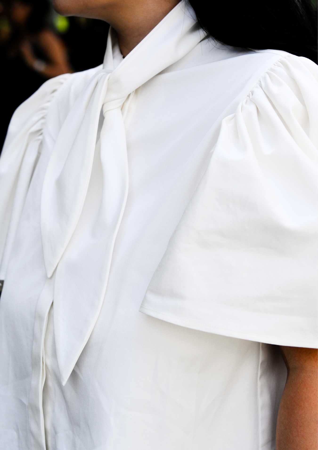 Butterfly sleeves and a soft neck tie. It’s made for days that call for a little lift. It’s feminine without without being fussy and playful without losing its polish.
